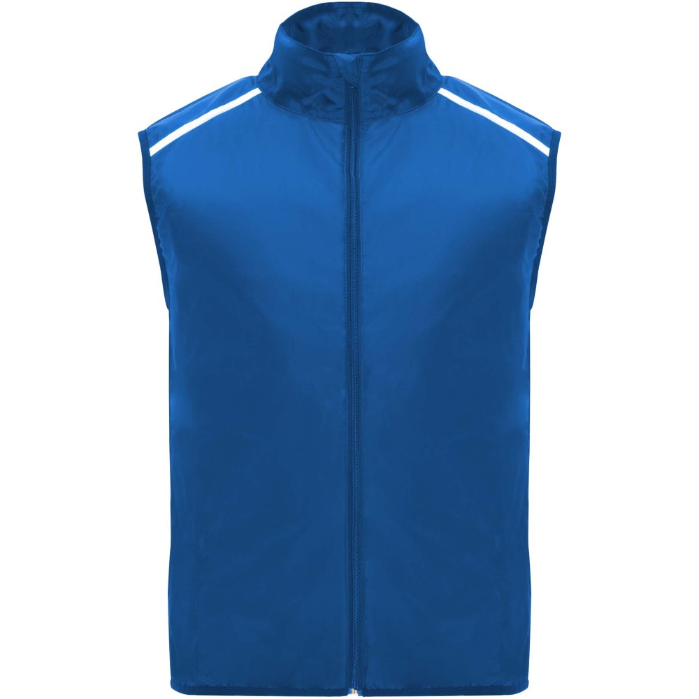 Szélálló és légáteresztő. Elülső cipzár azonos színű állvédővel. Rugalmas szegély a karkivágásnál és az alján. A hát alsó része mikroperforált anyagból készült. Fényvisszaverő csíkok a vállán. Zseb rugalmas pánttal, amelybe a mellényt el lehet csomagolni. Eltávolítható címke.