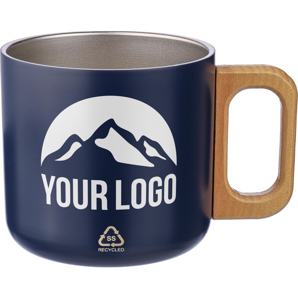 Duplafalú bögre fa fogantyúval. Mosogatógépben nem mosható. Gravírozott újrahasznosított rozsdamentes acél logóval. Egyenként barna kartondobozba csomagolva. Anyaga: újrahasznosított rozsdamentes acél. Űrtartalom: 400 ml.