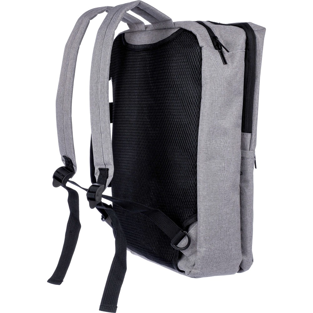 Hátizsák és laptoptáska 15 -es készülékhez. Kézipoggyász méretű. Hordozófüllel a tetején, állítható vállpántokkal és két oldalsó fogantyúval. Az állítható pántok a párnázás mögé rejthetők, így az oldalsó fogantyúkkal is hordozható. Tépőzáras laptoprekesszel és kis cipzáras zsebbel rendelkezik. Szellőző, párnázott hátoldallal. Terhelhetősége kb. 8 kg. RPET alapanyagra utaló címkével. Anyaga: 300D RPET poliészter.