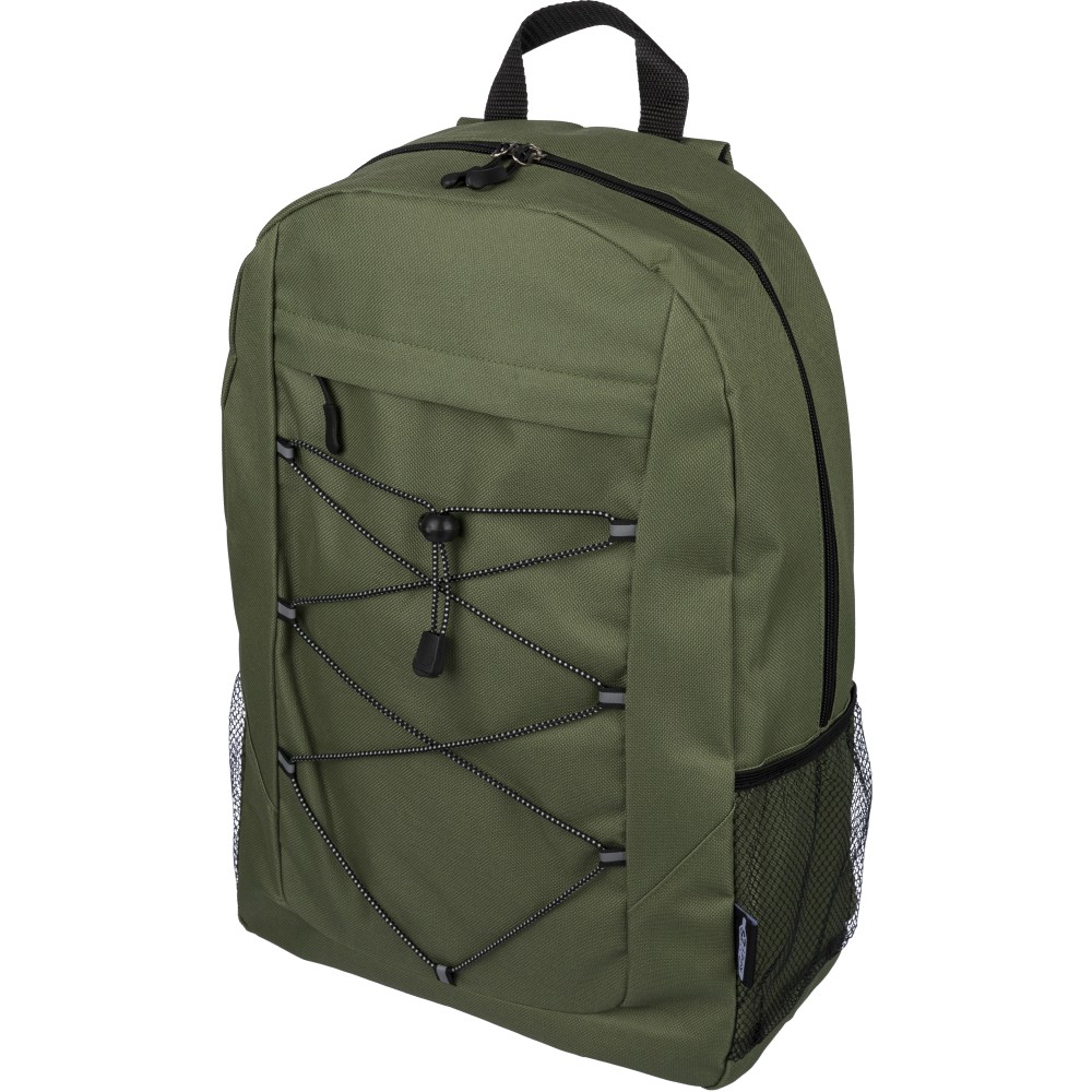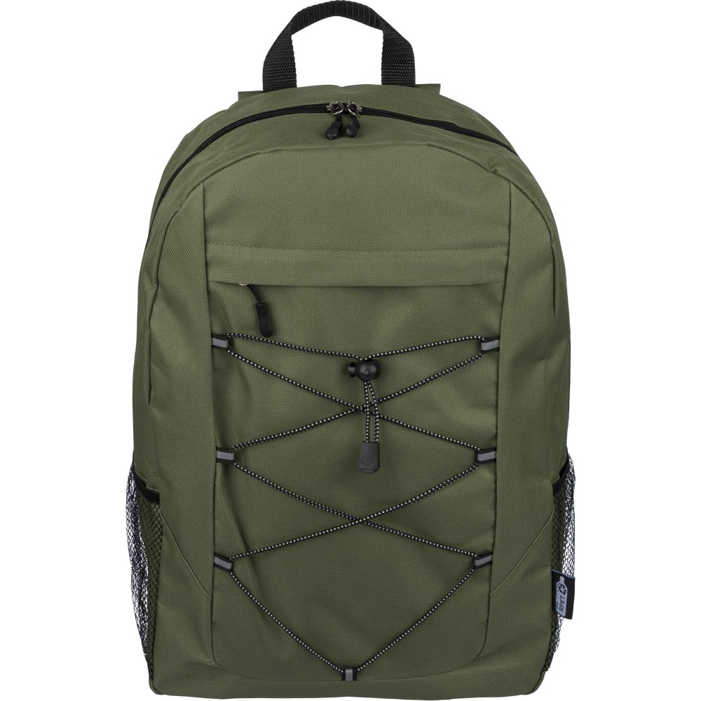 RPET poliészter 600D anyagból készült hátizsák húzózsinóros záródással és nagy cipzáras fő rekesszel. Hálós oldalzsebekkel, rugalmas elülső pántokkal, dekorációhoz kialakított kis elülső cipzáras zsebbel és állítható vállpántokkal rendelkezik. A terméken rPET alapanyagra utaló címke található.