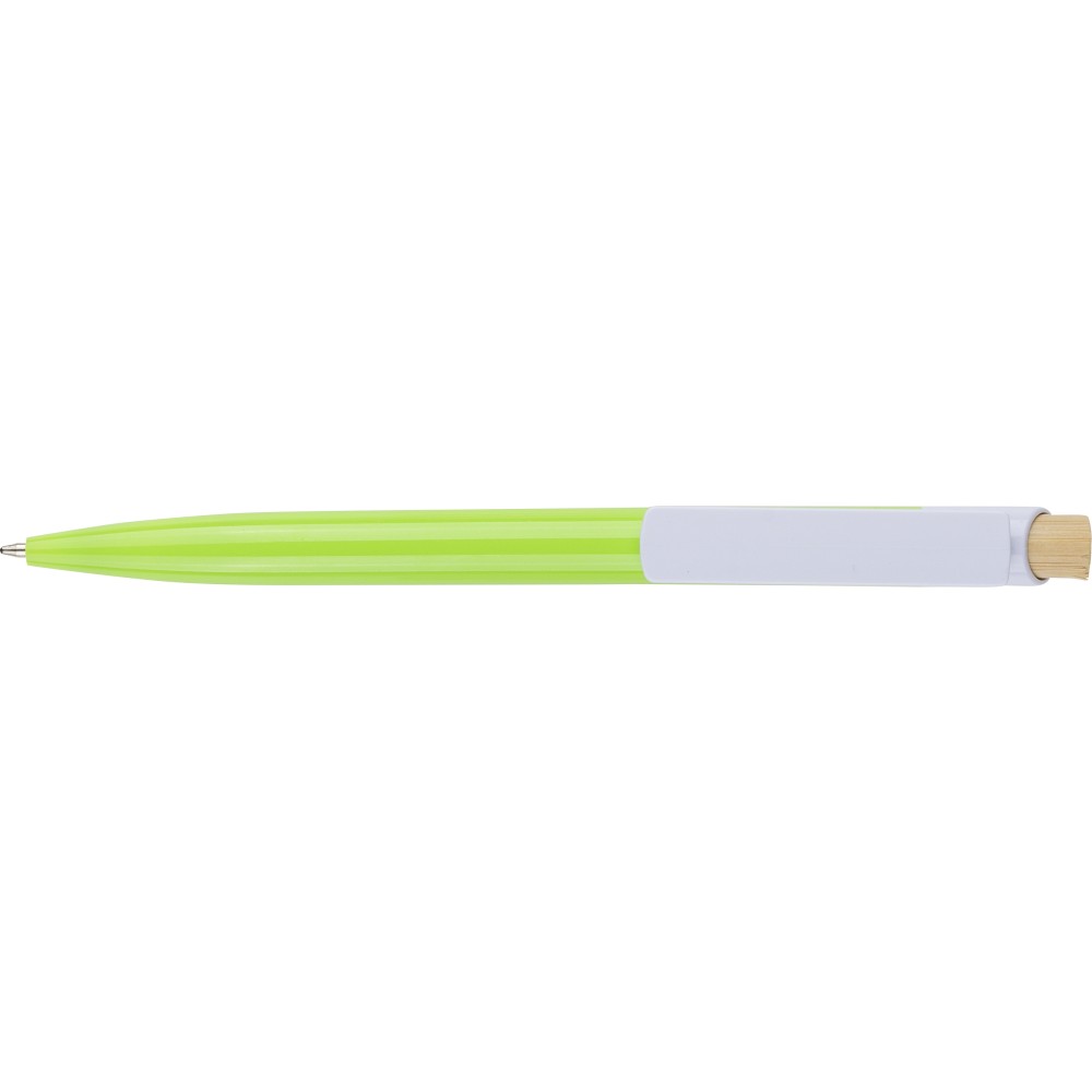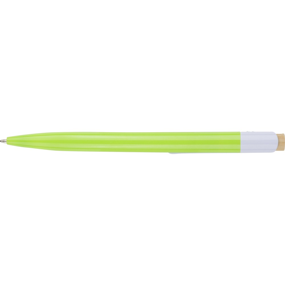 Újrahasznosított ABS-ből készült golyóstoll bambusz nyomógombbal és fehér klippel, digitális nyomtatásra alkalmas kivitelben. A tolltesten fröccsöntés során elhelyezett recycled (újrahasznosított) alapanyagra utaló logó található. Megközelítőleg 600 méter íráshosszúságú, kék színű tollbetéttel.