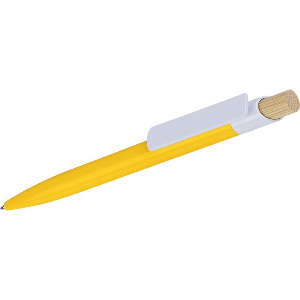 Újrahasznosított ABS-ből készült golyóstoll bambusz nyomógombbal és fehér klippel, digitális nyomtatásra alkalmas kivitelben. A tolltesten fröccsöntés során elhelyezett recycled (újrahasznosított) alapanyagra utaló logó található. Megközelítőleg 600 méter íráshosszúságú, kék színű tollbetéttel.