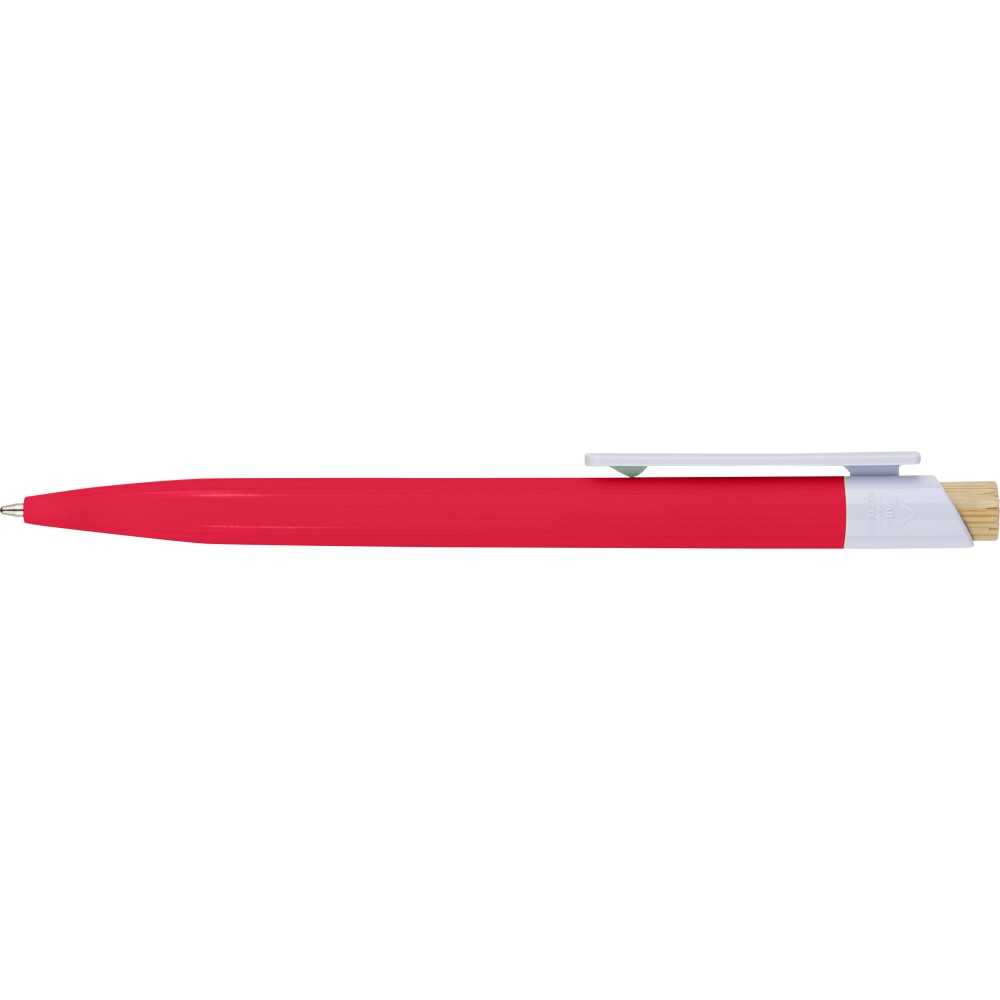 Újrahasznosított ABS-ből készült golyóstoll bambusz nyomógombbal és fehér klippel, digitális nyomtatásra alkalmas kivitelben. A tolltesten fröccsöntés során elhelyezett recycled (újrahasznosított) alapanyagra utaló logó található. Megközelítőleg 600 méter íráshosszúságú, kék színű tollbetéttel.