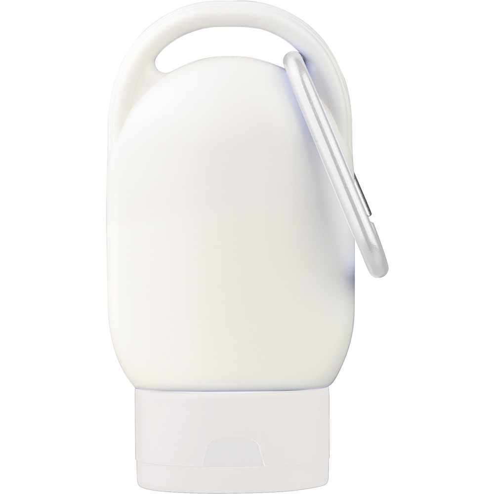 SPF 30 faktorszámú naptej színes kupakkal és a kupak színével harmonizáló karabinerrel. A hátoldalon az összetevőlista és a minőségmegőrzési idő szerepel. Szavatossági ideje 2 év. 30 ml.